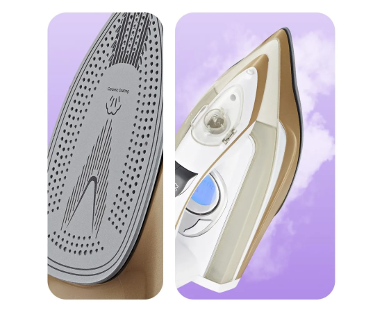 Подошва утюга имеет керамическое покрытие, благодаря которому утюг хорошо скользит и легко очищается. Такое покрытие убережёт ткани от затяжек и лишних складок.