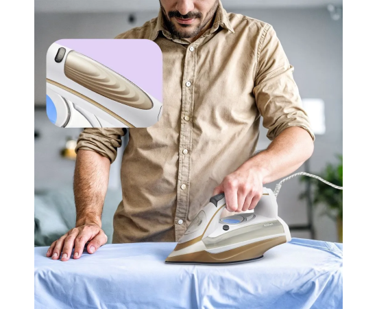 В ручке утюга расположен сенсорный датчик для подачи пара. В режиме подачи пара пар будет выходить из паровых сопел, пока вы держите прибор за ручку.