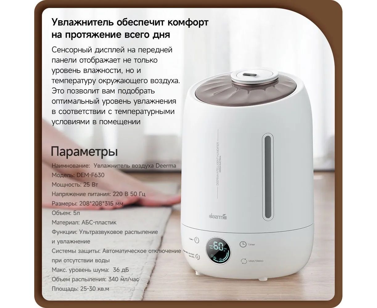 Увлажнитель воздуха для дома Deerma DEM-F630 – является улучшенной версией популярной модели со встроенным LED-дисплеем и отсеком для аромамасел. Наполните вашу квартиру любимыми ароматами и поднимите уровень влажности до комфортного уровня.
