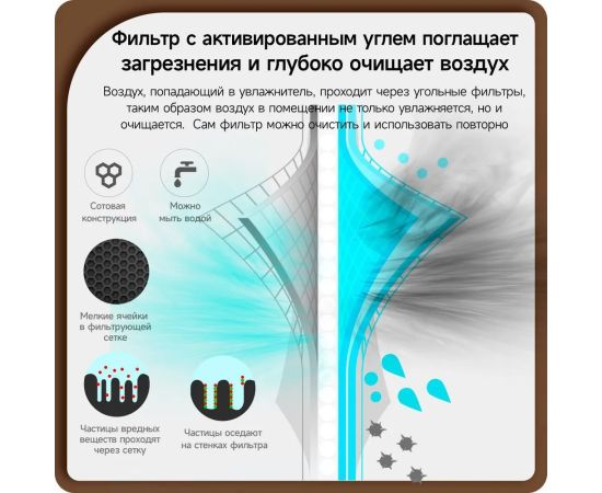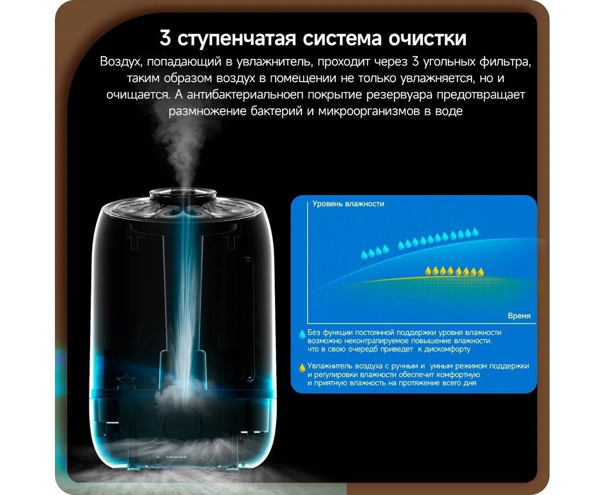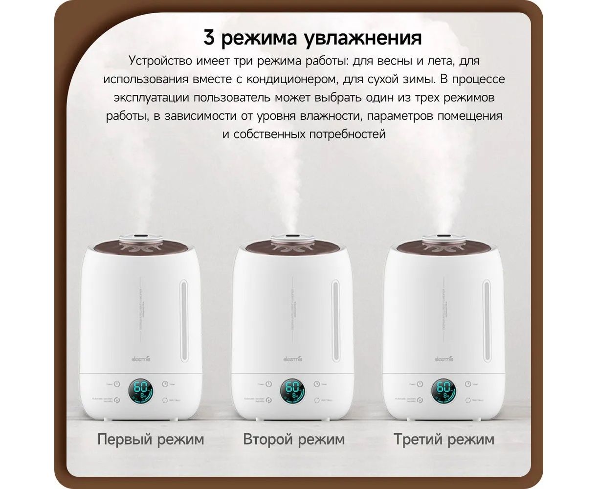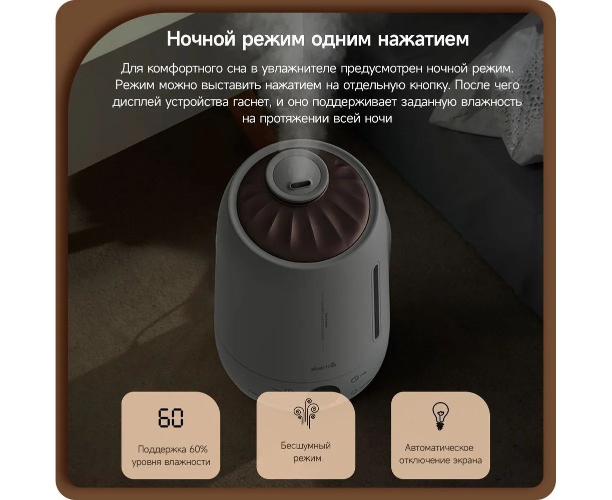 Встроенный LED-дисплей, Ароматизация воздуха, 12 часов увлажнения от одной заправки, 3 режима интенсивности испарения, ночной режим с минимальным уровнем шума