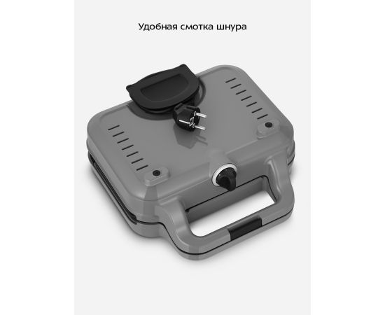 На нижней части корпуса прибора расположен держатель шнура, обеспечивающий удобство переноски и хранения. Зажим на ручке удерживает крышку вафельницы в закрытом состоянии, что делает транспортировку и хранение более удобными.
