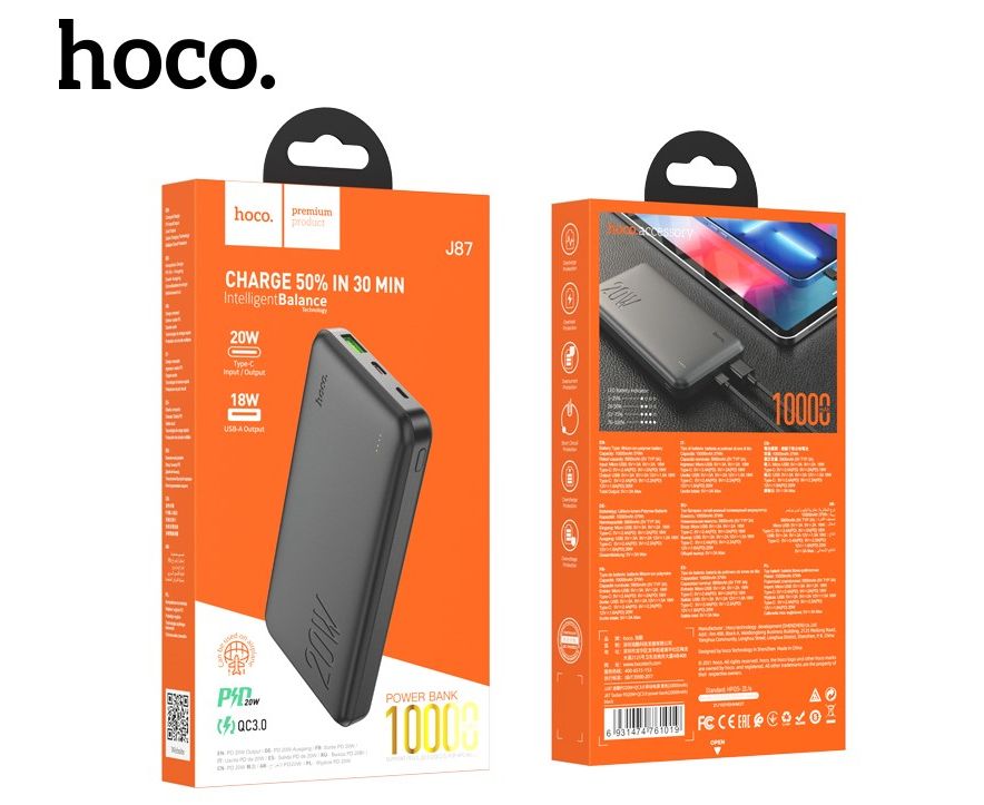 Внешний аккумулятор 10000mAh 2USB PD 20W+QC3.0 быстрая зарядкас LED-индикатором Hoco J87 (Black)