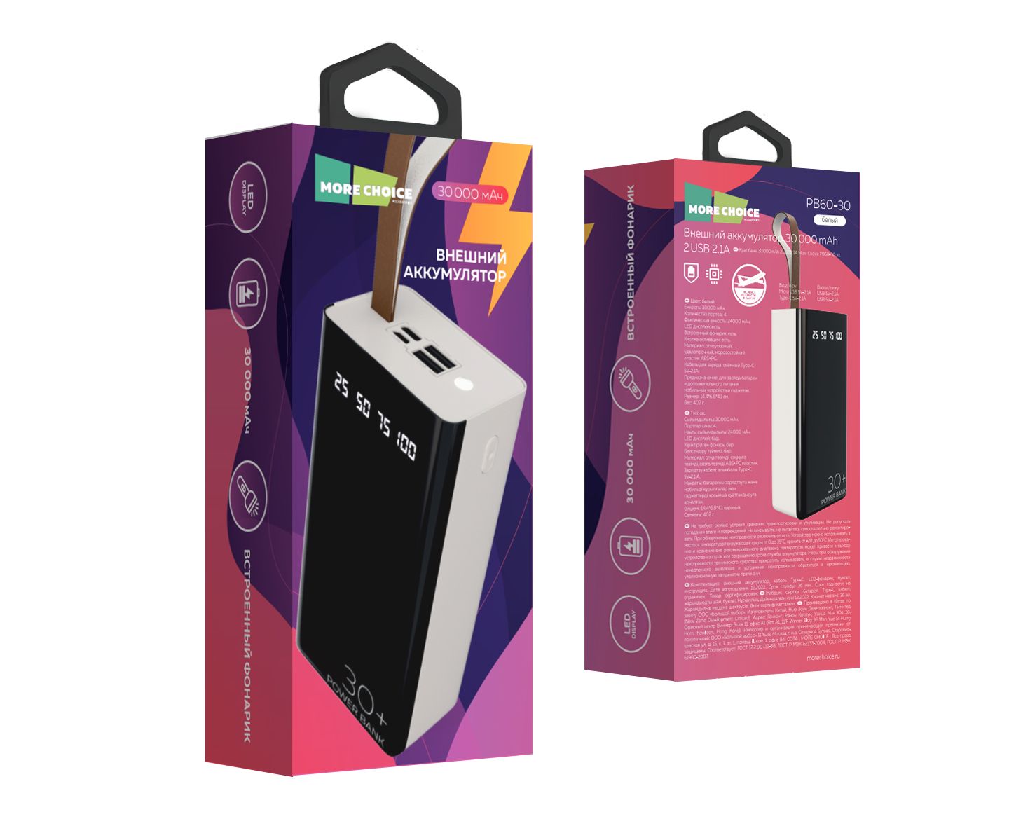 Емкость: 30000 мАч. Фактическая емкость 24000 мАч. Количество портов: 4 Вход: micro USB/Type-C 5V-2.1A. Выход: 2*USB 5V-2.1A. LED-дисплей: есть Материал: огнеупорный, ударопрочный, морозостойкий пластик ABS+PC, литий-ионная батарея. Дата-кабель в комплекте: Type-C (20 cм) Комплектация: внешний аккумулятор, дата-кабель, LED лампа, инструкция, буклет. Цвета: Black, White