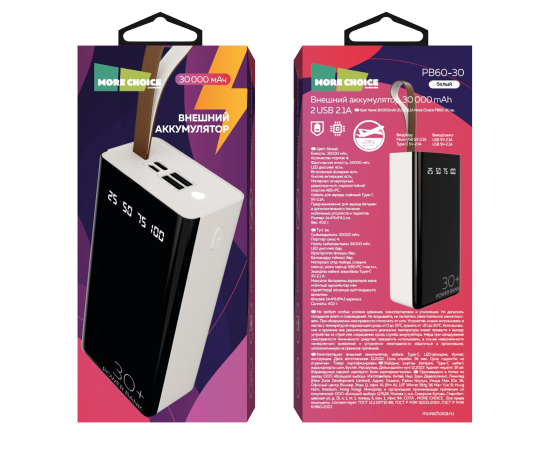 Внешний аккумулятор 30000mAh 2USB 2.1A More choice PB60-30 (White)