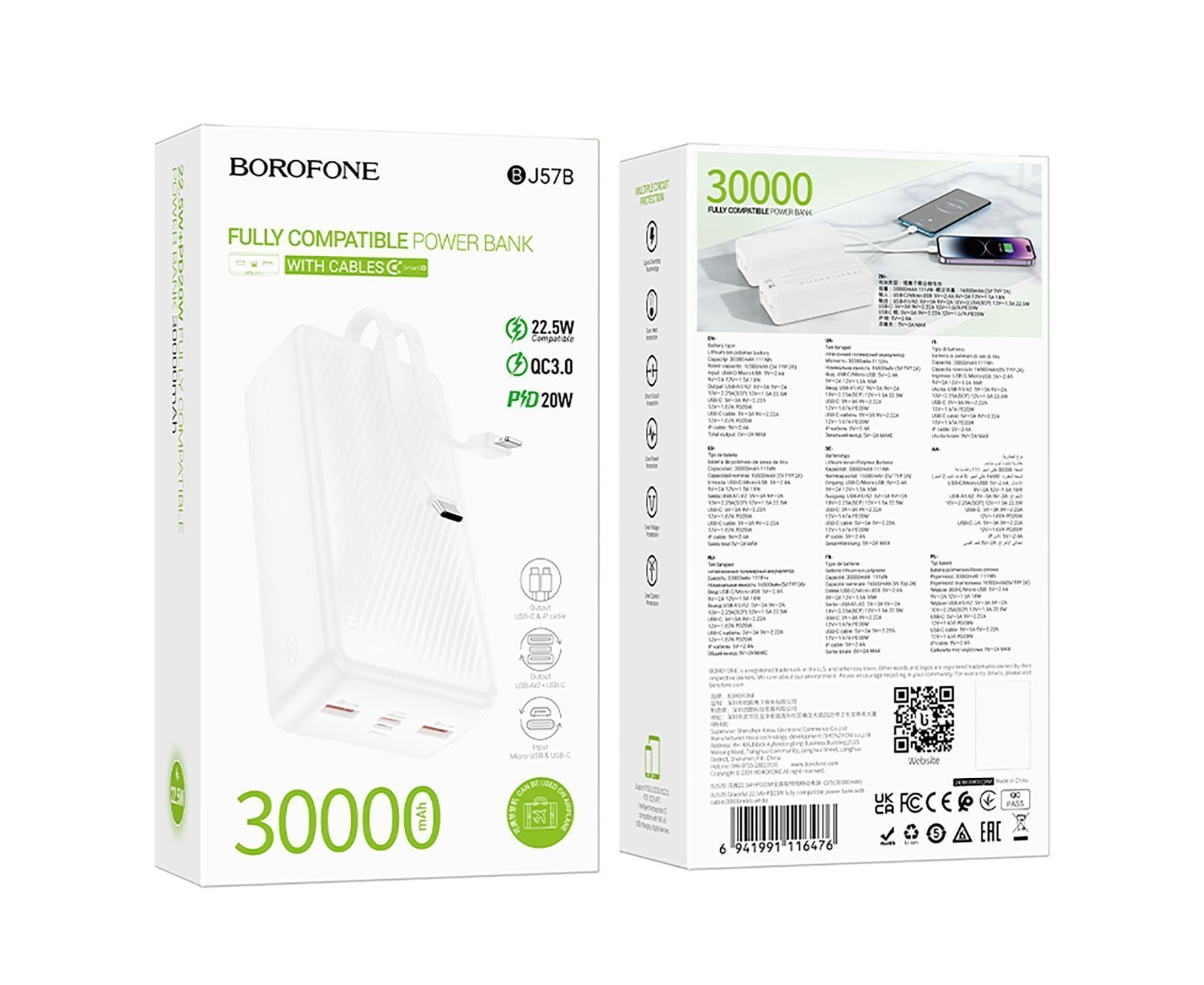Внешний аккумулятор Borofone BJ57B 22.5W+PD20W 30000mAh Micro/Type-C/2USB/Type-C (white)(235809)