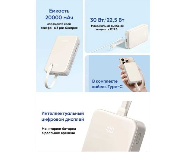 Внешний аккумулятор UGREEN PB521 (45207) 20000mAh PD30W Build-in USB-C Cable - White